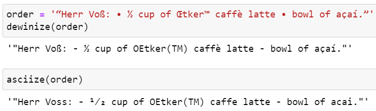 원형 따옴표, em dashes, 작은 점 등 서양 텍스트에서 널리 사용되는 기호들을 아스키에 해당하는 문자로 바꾸는 훨씬 더 극단적인 방법도 있습니다. 아래의 asciize() 함수는 이와 같이 극단적으로 텍스트를 변환합니다.