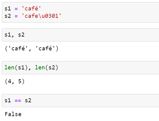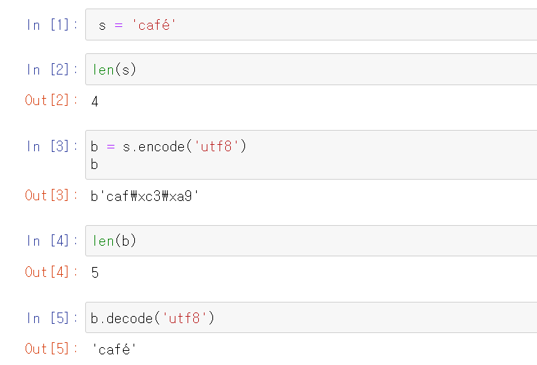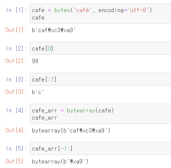 그렇기 때문에, 위 코드의 첫 번째 줄에서 b'caf\xc3\xa9'로 출력합니다. 처음 3바이트 b'caf'는 출력 가능한 아스키 범위에 있지만, 나머지 2바이트는 범위에 속하지 않기 때문입니다.
