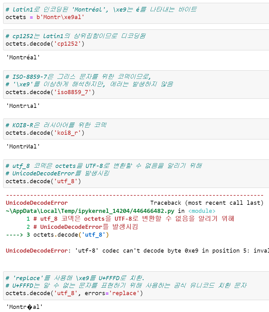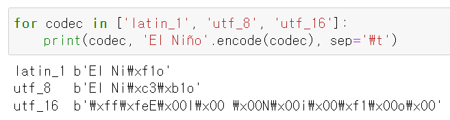 텍스트를 바이트 혹은 바이트를 텍스트로 변환하기 위해 파이썬에는 100여 개의 코덱(인코더/디코더)이 포함되어 있습니다. 각 코덱은 utf_8과 같은 이름을 갖고 있는데, utf8, utf-8, U8 등으로 불리기도 합니다. 코덱은 open(), str.encode(), bytes,decode() 등의 함수를 호출할 때 encoding 인수에 전달해서 사용할 수 있습니다. 다음 코드는 하나의 텍스트를 세 개의 서로 다른 바이트 시퀀스로 인코딩한 결과를 보여줍니다.