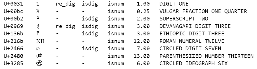 sample = '1\xbc\xb2\u0969\u136b\u216b\u2466\u2480\u3285'