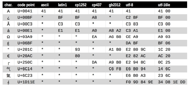 위 그림에서 별표는 ASCII나 GB2312 같은 multibytes 인코딩도 유니코드 문자를 모두 표현할 수 없다는 것을 보여줍니다. 그러나 UTF 인코딩은 모든 유니코드 코드 포인터를 처리할 수 있도록 만들어졌습니다.