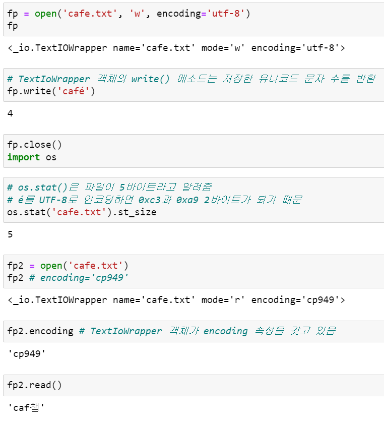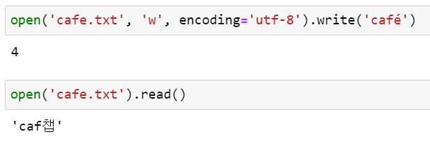 다음 예제 코드는 잘못된 코덱을 사용해서 문자가 깨지거나 UnicodeDecodeError가 발생하는 예를 보여줍니다.