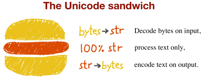 이는 입력할 때(파일을 읽기 위해 열 때) 가능하면 빨리 bytes를 str로 변환해야 한다는 것을 의미합니다. 샌드위치에 들어가는 패티는 프로그램의 비즈니스 로직에 해당하는 부분이며, 여기서는 텍스트를 오직 str 객체로 다룹니다. 즉, 다른 처리를 하는 도중에 인코딩이나 디코딩을 하면 안됩니다. 출력할 때는 가능한 늦게 str을 bytes로 인코딩합니다. 대부분의 웹 프레임워크도 이렇게 작동하며, 처리하는 동안 bytes를 다루는 일은 거의 없습니다. Django의 경우 뷰는 유니코드 str만 출력하고, Django 자체가 응답을 bytes(기본적으로 UTF-8 인코딩)로 인코딩하는 일을 담당합니다.