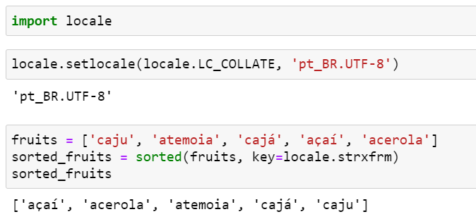 locale.strxfrm() 함수를 활성화하려면 먼저 어플리케이션에 대해 적절히 현지어를 설정하고, OS가 이 설정을 지원하도록 기도(?)해야 합니다.. 위의 과일 목록을 정렬하기 위해서 locale.setxfrm() 함수를 사용한 예는 다음과 같습니다.