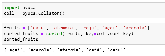 Django의 contributor인 James Tauber도 이 문제를 겪고 유니코드 대조 알고리즘(Unicode Collation Algorithm; UCA)를 순수 파이썬으로 구현한 PyUCA를 만들었습니다. 이를 사용하는 방법은 다음과 같이 아주 간단합니다.