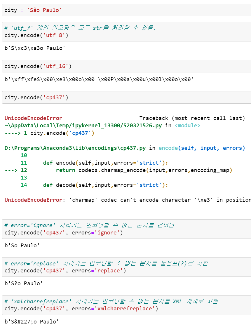 대부분의 non-UTF 코덱은 유니코드 문자의 일부만 처리할 수 있습니다. 텍스트를 바이트로 변환할 때 문자가 대상 인코딩에 정의되어 있지 않으면, 인코딩 메소드나 함수의 errors 인수에 별도의 처리기를 지정하지 않는 한 UnicodeEncodeError가 발생합니다. 에러 처리기를 사용하는 방법은 다음과 같습니다.