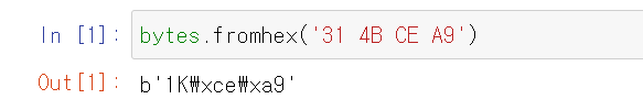 위에서 보듯이 bytes는 str에 인코딩을 지정해서 만들 수 있습니다. bytes의 각 항목은 range(256)에 속하는 정수이며, bytes는 슬라이싱해도 bytes인데, 이는 슬라이스가 한 바이트일 때도 마찬가지입니다.