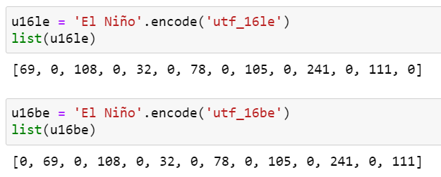 UTF-16으로 인코딩된 'El Niño'의 텍스트 앞에 여분의 바이트가 있다는 것을 확인할 수 있습니다.