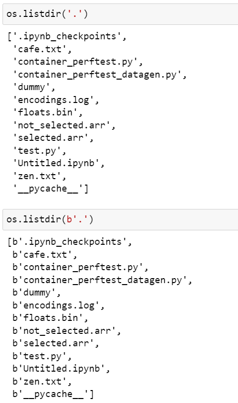 하지만 이렇게 처리할 수 없는 파일명을 다루거나 수정해야 할 때는 bytes 인수를 os 함수에 전달해서 bytes 반환값을 가져올 수 있습니다. 파일명이나 경로명에 얼마나 많은 깨진 문자가 있는지에 상관없이 이 방식을 사용할 수 있습니다.