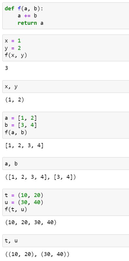 이러한 체계의 결과로, 함수는 인수로 전달받은 모든 가변 객체를 변경할 수 있지만, 객체의 identity 자체는 변경할 수 없습니다. 즉, 어떤 객체를 다른 객체로 바꿀 수 없습니다. 아래 예제 코드는 매개변수 중 하나에 += 연산자를 사용하는 간단한 함수를 보여줍니다. 함수에 숫자, 리스트, 튜플을 전달하면, 전달받은 인수는 서로 다른 영향을 받습니다.