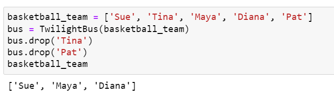 여기서 문제는 bus가 생성자에 전달된 리스트의 별명이라는 점입니다. 여기서는 TwilightBus 객체 고유의 리스트를 유지해야 합니다. 해결하는 방법은 __init__() 메소드가 passengers 인수를 받을 때 인수의 사본으로 self.passengers를 초기화하면 됩니다.