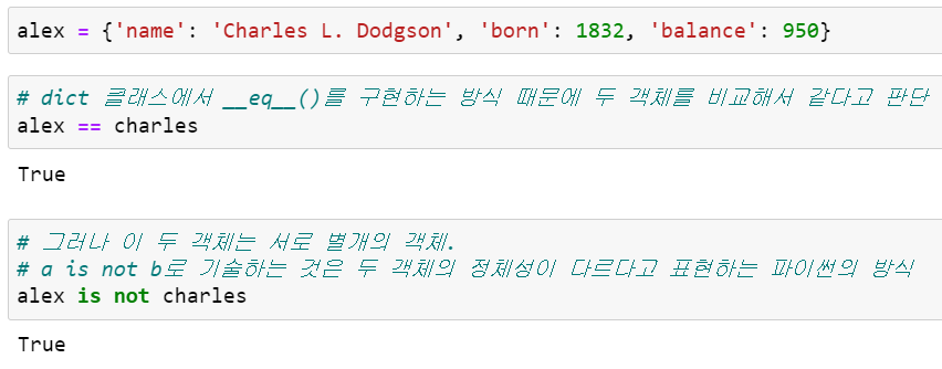 Lewis Carroll은 Charles Lutwidge Dodgson 교수의 필명입니다. 그렇다면 Carroll은 Dodgson 교수와 같을 뿐만 아니라, 단 한 명의 동일인입니다. 아래 코드는 이러한 개념을 파이썬으로 표현하고 있습니다.