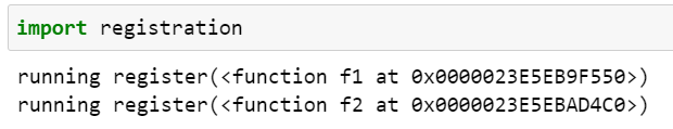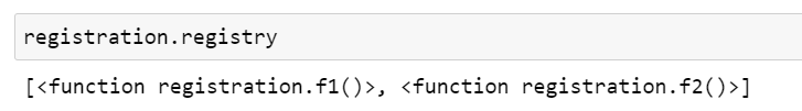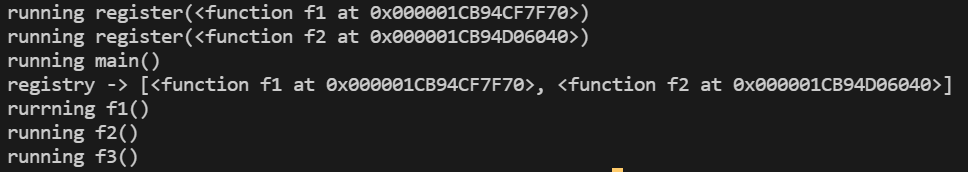 모듈이 로딩된 후 registry는 데코레이트된 두 개의 함수 f1()과 f2()에 대한 참조를 가집니다. 이 두 함수(f3()도 포함하여)는 main()에 의해 명시적으로 호출될 때만 실행됩니다.