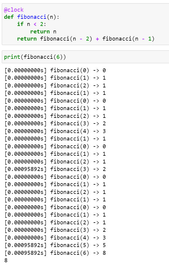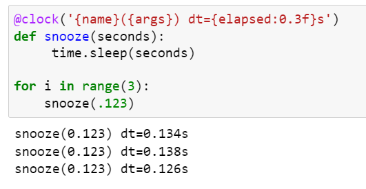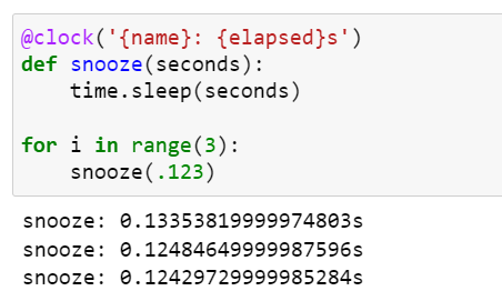위에서 살펴봤던 clock() 데코레이터 예제를 이용해서 기능을 추가해보도록 하겠습니다. 추가되는 기능은 사용자가 문자열 포맷을 전달하여 함수가 출력할 문자열을 설정하도록 하는 것입니다.