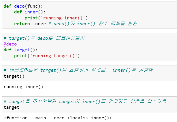 결과는 동일합니다. 두 코드를 실행한 후 target은 꼭 원래의 target() 함수를 가리키는 것이 아니며, decorate(target)이 반환한 함수를 가리키게 됩니다.