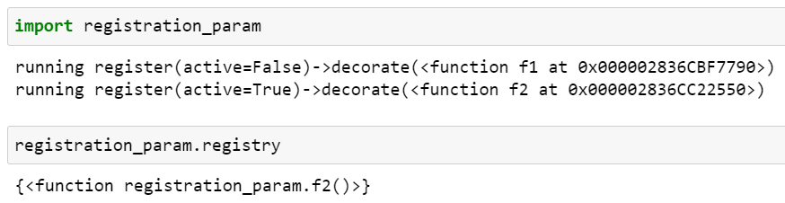 f2() 함수만 registry에 남아 있는 것을 확인할 수 있습니다. register() 데코레이터 팩토리에 active=False를 전달했으므로 f1()에 적용된 decorate()는 registry에 f1() 함수를 추가하지 않았습니다.