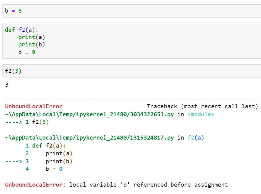 먼저 print(a) 문이 출력되면서 3이 출력됩니다. 그러나 두 번째 문장 print(b)는 실행되지 않습니다. 전역 변수 b가 있고 print(b) 다음에 지역 변수 b에 할당하는 문장이 나오므로 전역 변수의 값인 6이 출력될 것이라고 생각되었지만 그러지 않았습니다.