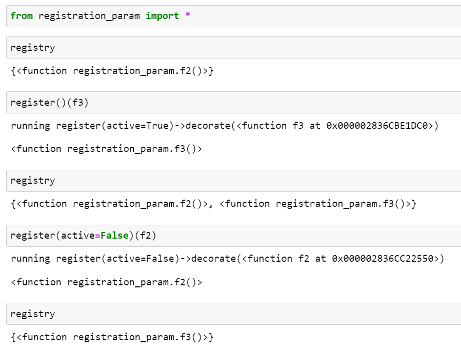 데코레이터가 실제 코드에서 흔히 사용되는 방식과 비교해서 위에서 살펴본 registration.py 코드는 다음의 2가지 차이점이 있습니다.