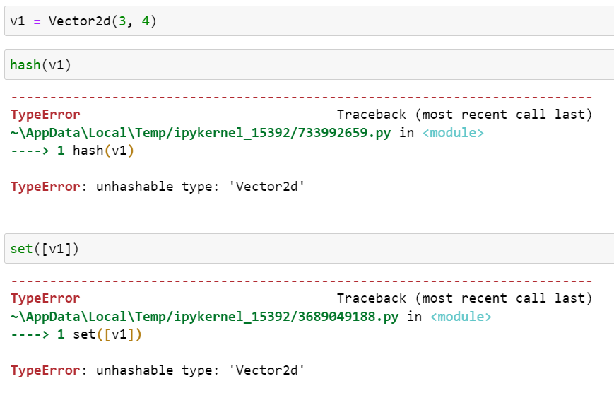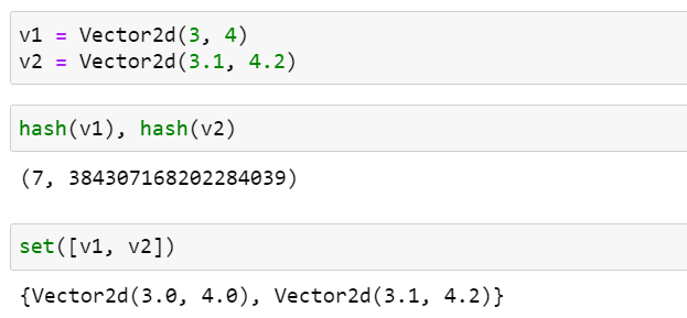 지금까지 정의한 Vector2d는 해시할 수 없습니다. 그러므로 집합 안의 항목으로 사용할 수 없습니다.