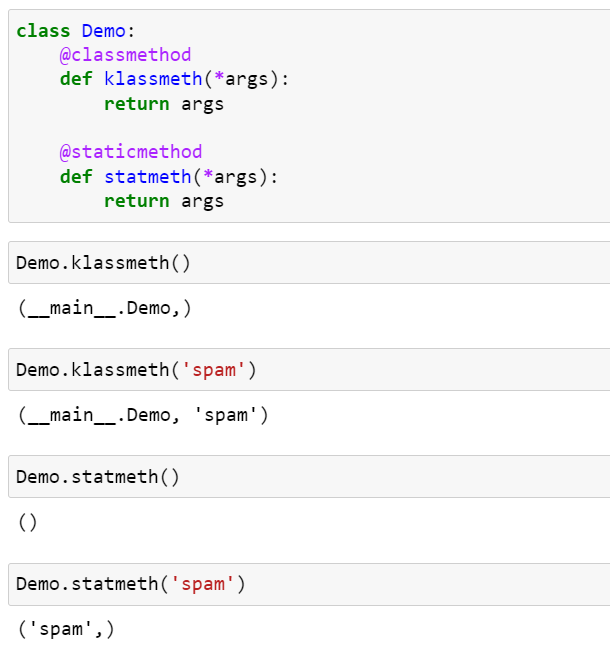반대로 @staticmethod 데코레이터는 메소드가 특별한 첫 번째 인수를 받지 않도록 메소드를 변경합니다. 본질적으로 static 메소드는 모듈 대신 클래스 본체 안에 정의한 평범한 함수일 뿐입니다. 아래 예제 코드는 @classmethod와 @staticmethod 데코레이터의 동작을 비교해서 보여줍니다.