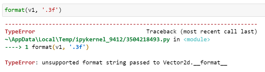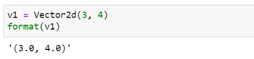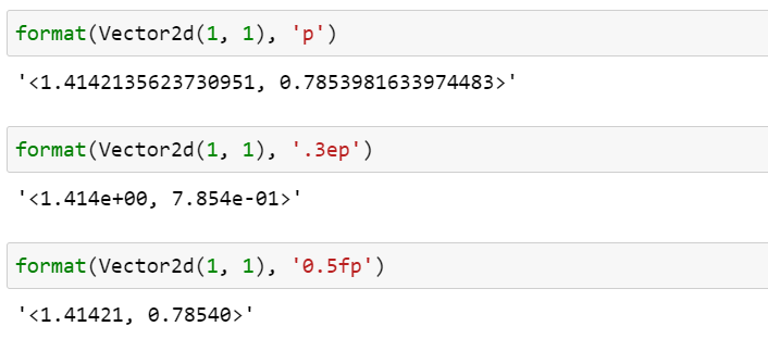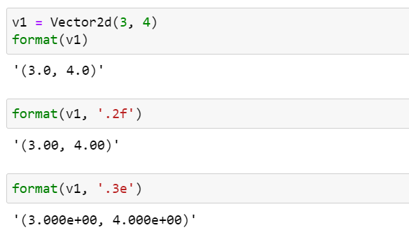 Vector2d 클래스 자체의 format specification mini-language를 구현하면 이 문제를 해결할 수 있습니다. 먼저 사용자가 제공하는 format specifier를 벡터의 각 float 형 요소를 포맷하기 위한 것이라고 가정하겠습니다. 즉, 다음의 결과가 나오기를 원한다고 가정합니다.