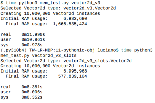천만 개를 가진 리스트를 만드는 스크립트(link)를 실행하여, 비교한 결과는 다음과 같습니다. 첫 번째 실행은 __slots__이 없는 Vector2d, 두 번째 실행은 __slots__을 추가한 Vector2d입니다. 스크립트에서 사용하는 resource가 윈도우에서는 사용이 안되는 것 같아, 교재의 결과를 첨부합니다.