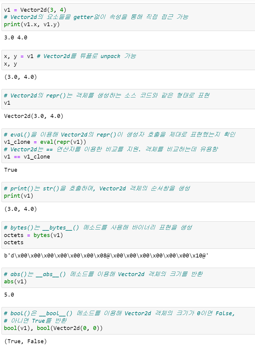 정리하자면 Vector2d 요소는 'private' 요소이며, Vector2d 객체는 'immutable'입니다(파이썬에는 private 속성과 불변 속성을 정의하는 진정한 방법은 없습니다).