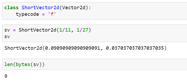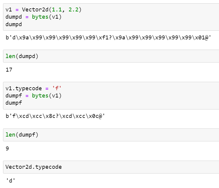 Vector2d.typecode의 기본값이 'd'이므로 객체를 bytes로 export할 때 Vector2d의 각 요소가 8바이트 double-precision 실수로 표현됩니다. 만약 Vector2d 인스턴스의 typecode를 'f'로 설정하면, 각 요소는 4바이트 single-precision 실수로 export됩니다. 다음 예제 코드를 살펴보겠습니다. (__slots__ 속성은 제거한 상태입니다.)