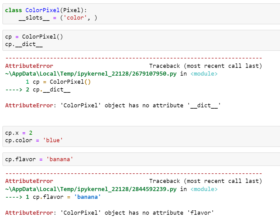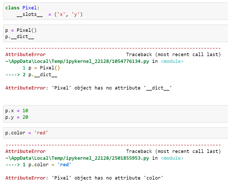 위 코드에서 Pixel의 인스턴스를 생성하는데, 인스턴스에서 __slots__의 영향을 확인할 수 있습니다. 첫 번째는 Pixel의 인스턴스는 __dict__를 가지고 있지 않습니다. 두 번째는 p.x와 p.y 속성은 값을 설정할 수 있지만, __slots__에 없는 속성에 값을 설정하려고 시도하면 AttributeError가 발생합니다.
