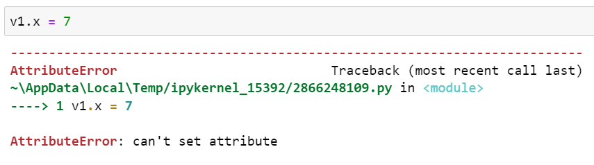 현재 구현된 Vector2d가 불변형이 아니므로 v1.x = 7과 같이 속성을 변경하는 코드를 입력할 수 있습니다.