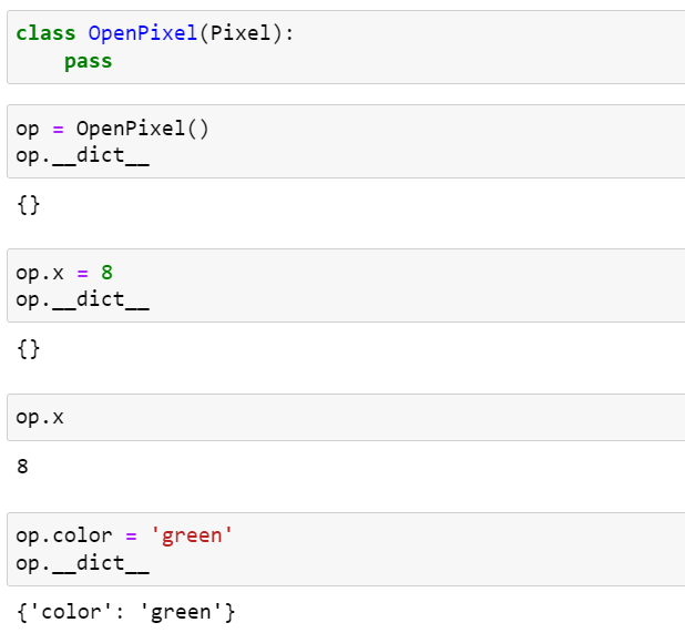 위에서 정의된 OpenPixel은 소유하는 속성이 없습니다. 이 클래스로 생성된 인스턴스는 __dict__를 가지고 있는 것을 확인할 수 있습니다. 그리고 베이스 클래스 Pixel의 __slots__에 명명된 x 속성에 값을 설정한다면, 이것은 인스턴스의 __dict__에 저장되지 않는 것을 볼 수 있습니다. 즉, 인스턴스의 숨겨진 배열의 참조에 저장되었다는 것을 의미합니다. 만약 __slots__에 명명되지 않은 속성을 설정하게 되면, 이 속성은 __dict__에 저장됩니다.