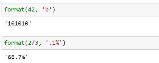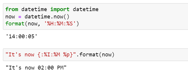 각 클래스가 format_spec 인수를 자신이 원하는 대로 해석해서 format specification mini-language를 확장할 수 있습니다. 예를 들어, datetime 모듈의 클래스들은 자신의 __format__() 메소드에서 strftime() 함수와 동일한 포맷 코드를 사용합니다. 다음 코드에서 format() 내장 함수와 str.format() 메소드를 실행하는 예를 살펴보겠습니다.