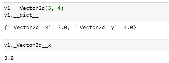 private name이 어떻게 만들어지는지 아는 사람은 위 예제 코드의 마지막 문장에서 보여주는 것처럼 비공개 속성을 직접 읽을 수 있습니다. 사실 이 기법은 디버깅과 serialization에 유용하게 사용됩니다. 그리고 v1._Vector2d__x = 7과 같이 작성하면 Vector2d의 비공개 요소에 직접 값을 할당할 수도 있습니다.