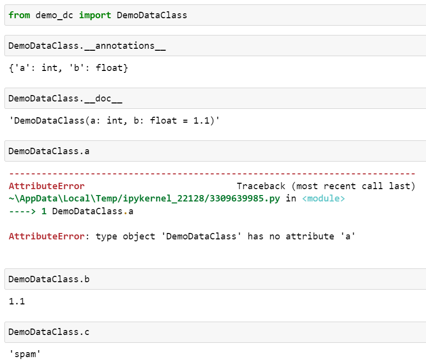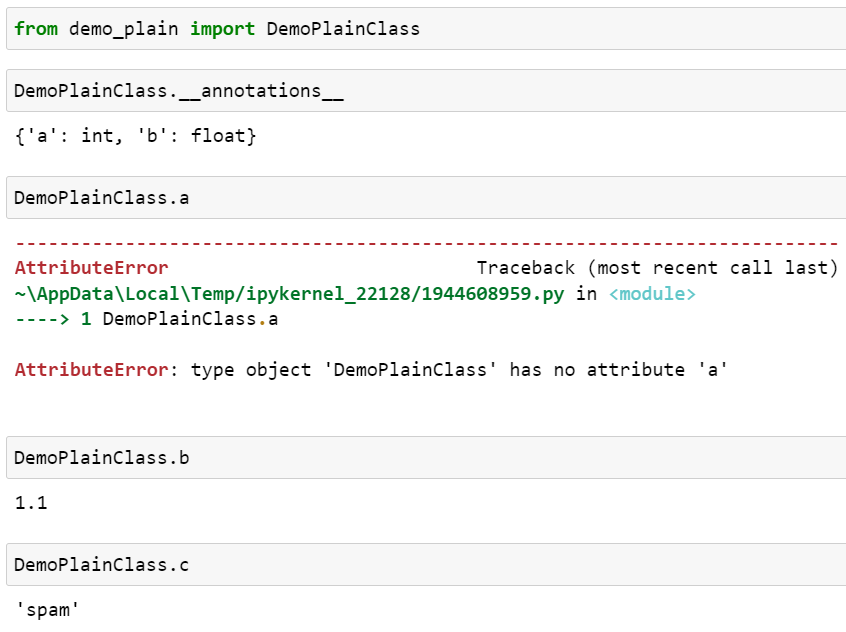 typing.NamedTuple과 @dataclass로 정의된 클래스는 __annotations__ 클래스 속성으로 타입 어노테이션에 대한 필드 이름의 매핑을 가지고 있습니다. 위에서 언급했듯이, 직접 __annotations__를 읽는 것보다 typing.get_type_hints 함수를 사용하는 것이 좋습니다.