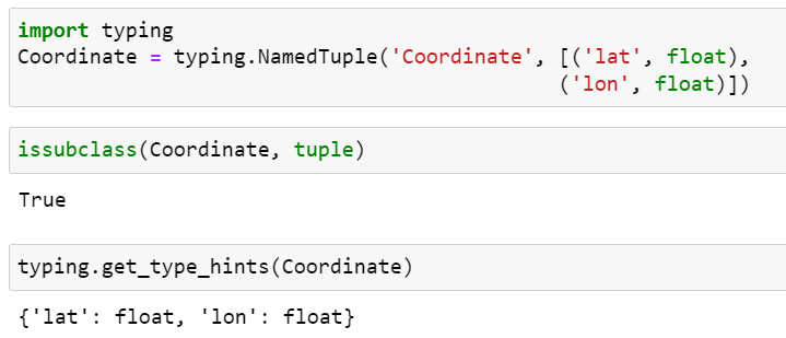 issubclass(Coordinate, typing.NamedTuple) # False issubclass(Coordinate, tuple) # True