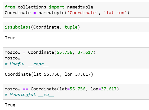 아래 코드는 namedtuple로 구축된 Coordinate 클래스입니다. 이 팩토리 함수는 tuple의 서브클래스를 구축하며 생성된 빌더는 사용자가 지정한 이름과 필드를 가지고 있습니다.