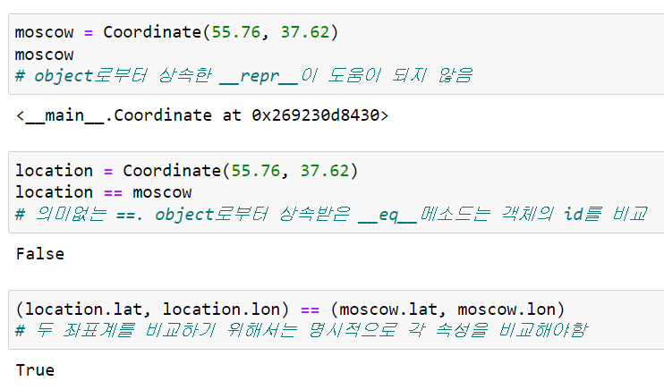 Coordinate 클래스는 위도와 경도를 나타내는 속성을 가지고 있는 역할을 합니다. 이렇게 작성된 __init__은 만약 클래스가 2가지 이상의 속성을 가지게 된다면, 수정할 필요가 생깁니다. 그리고 파이썬 객체로부터 기대되는 기본 기능들을 제공하지도 않습니다.