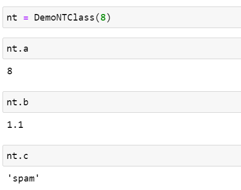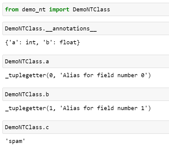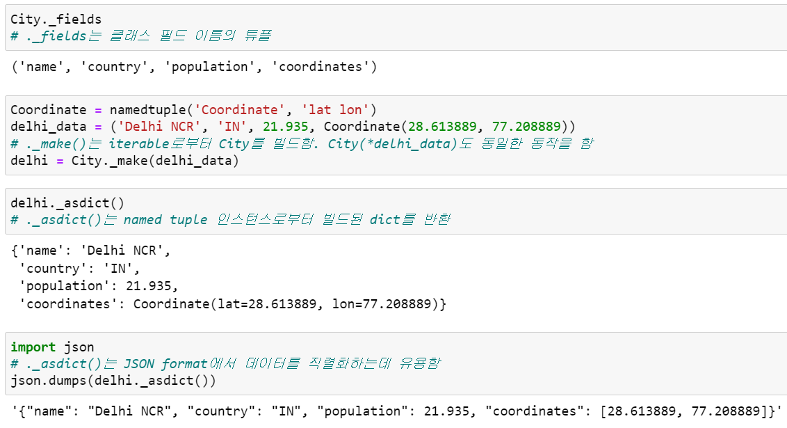 named tuple는 다음 예제에서 보듯이 _fields 클래스 속성, _make(iterable) 클래스 메소드, _asdict() 인스턴스 메소드와 같은 tuple로부터 상속받은 몇 가지 속성과 메소드를 제공합니다.