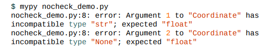 타입 힌트의 효과를 살펴보기 위해, 예를 들어, Mypy를 사용해서 위 코드를 실행시키면 다음과 같은 에러가 발생합니다.