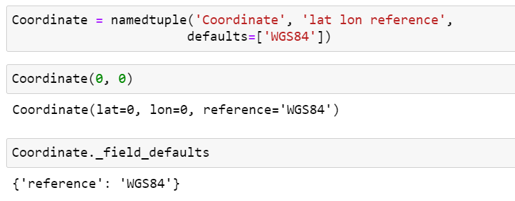 파이썬 3.7부터 namedtuple은 클래스의 가장 오른쪽에 있는 N개의 필드에 대해 N개의 기본값의 iterable을 제공함으로써 defaults 키워드-only 인수를 받습니다. 다음 예제 코드는 reference 필드의 기본값을 가지는 Cooridnate named tuple을 정의하는 방법을 보여줍니다.