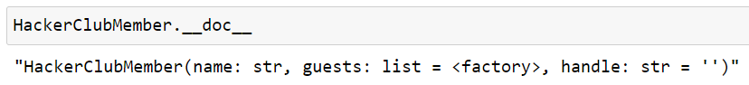 여기서 우리는 키워드 인수로 handle을 반드시 제공해야 하는데, HackerClubMember는 ClubMember로부터 name과 guests를 상속받고, handle 필드를 추가하기 때문입니다. HackerClubMember에서 생성된 docstring은 생성자 호출에서 필드 순서를 보여줍니다.