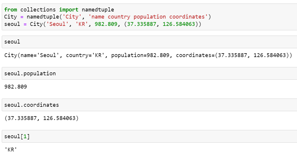 다음 예제 코드는 도시에 대한 정보를 담고 있는 named tuple을 정의하는 것을 보여줍니다.