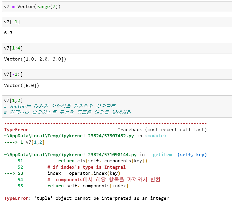이번 포스팅에서는 다차원 벡터를 표현하는 클래스 Vector를 여기까지 구현해보도록 하겠습니다. 스페셜 메소드들을 이용하여 다른 시퀀스형과 같은 동작을 수행할 수 있는 것에 초점을 맞추었습니다 !