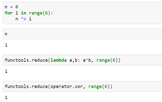 이제 다시 해시 문제로 돌아가보겠습니다. 아래 예제 코드는 0에서 5까지의 숫자에 XOR을 누적 계산하는 3가지 방법을 보여줍니다. 첫 번째는 for루프, 두 번째와 세 번째는 reduce() 함수를 사용합니다.