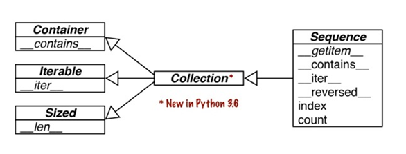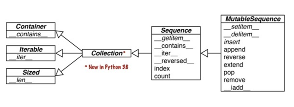 모든 컬렉션은 이 ABC를 상속하거나, 적어도 호환되는 프로토콜을 구현해야 합니다. Iterable은 __iter__()를 통해 반복을, Container는 __contains__()를 통해 in 연산자를, Sized는 __len__()을 통해 len() 메소드를 지원합니다. - Collection :