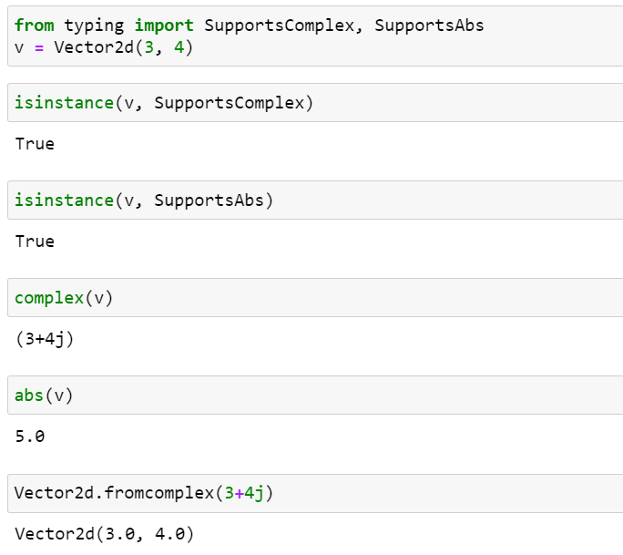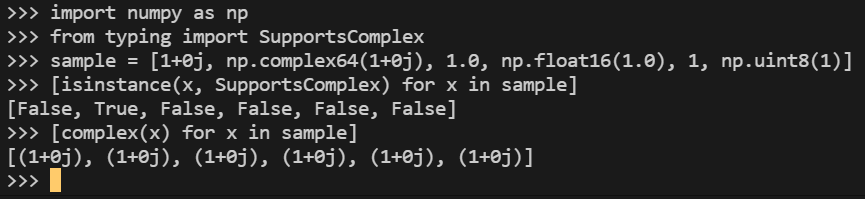 반대의 문제도 발생합니다. 내장 타입 complex, float, int, 그리고 numpy.float16, numpy.unit8 또한 __complex__ 메소드를 가지고 있지 않습니다. 따라서 isinstance(x, SupportsComplex)는 False를 반환합니다. np.complex64와 같은 Numpy complex 타입은 내장 타입 complex로 변환하기 위한 __complex__() 메소드를 구현합니다.