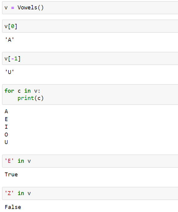 완전한 프로토콜을 구현하기 위해서는 여러 메소드들이 필요하지만, 이 메소드들 중의 일부만 구현해도 괜찮습니다. 아래 예제 코드의 Vowels 클래스를 살펴보겠습니다.