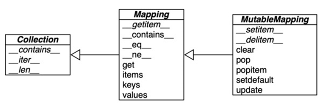 collections.abc의 공식 문서는 ABC 클래스들 간의 관계, 추상(abstract) 및 구상(concrete) 메소드를 표(link) 형태로 요약해서 잘 설명해주고 있습니다. 다중 상속도 많이 볼 수 있지만, 여기에서는 다루지 않도록 하며 일반적으로 ABC에서는 다중 상속이 문제가 되지 않는다는 정도만 알아두면 좋습니다.