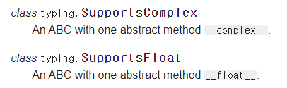 - SupportsComplex나 SupportsFloat와 같은 numeric static protocols는 static typing에 잘 동작한다. 하지만 complex number가 포함될 때 구스 타이핑은 신뢰할만하지 않다