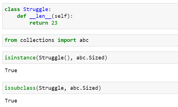간략하게 정리하면, 구스 타이핑은 ABCs를 서브클래싱하여 이전에 정의한 인터페이스를 구현하고 있음을 명시합니다. 그리고 구스 타이핑은 isinstance와 issubclass의 두 번째 인수로 구체적인 클래스 대신 ABCs를 사용하여 런타임 타입 검사를 수반합니다.